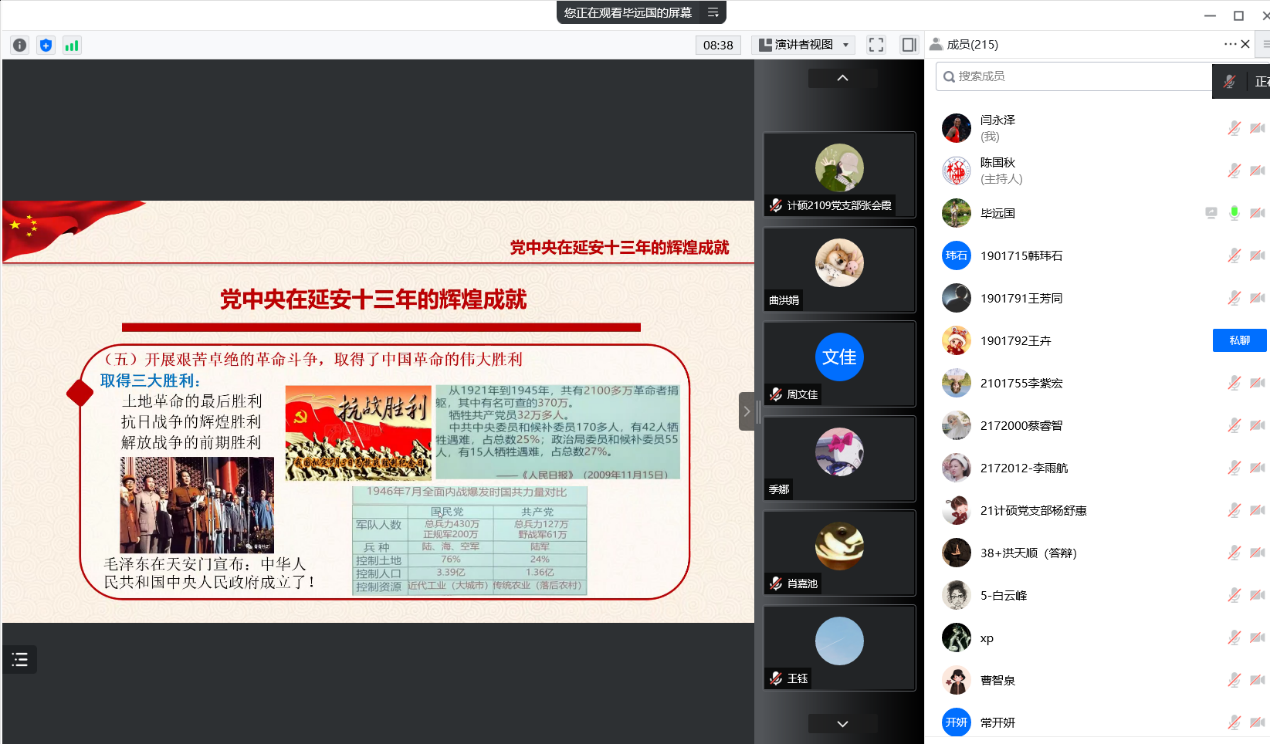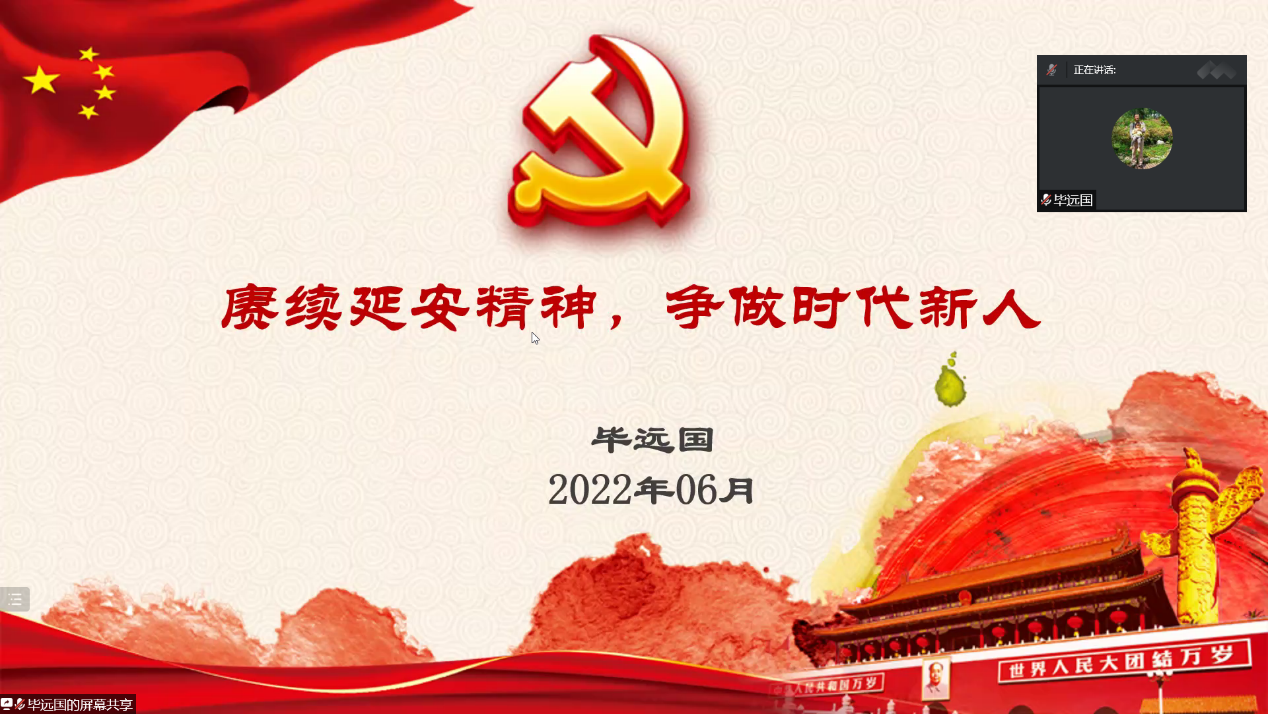 6月20日中午,2138com太阳集团学生党总支利用腾讯会议线上举办专题党课。本次党课以“赓续延安精神,争做时代新人”为主题,由2138com太阳集团党委副书记兼纪委书记毕远国教授主讲,本、硕、博200多名学生党员参加了本次党课。党课由学院党委组织员陈国秋主持。